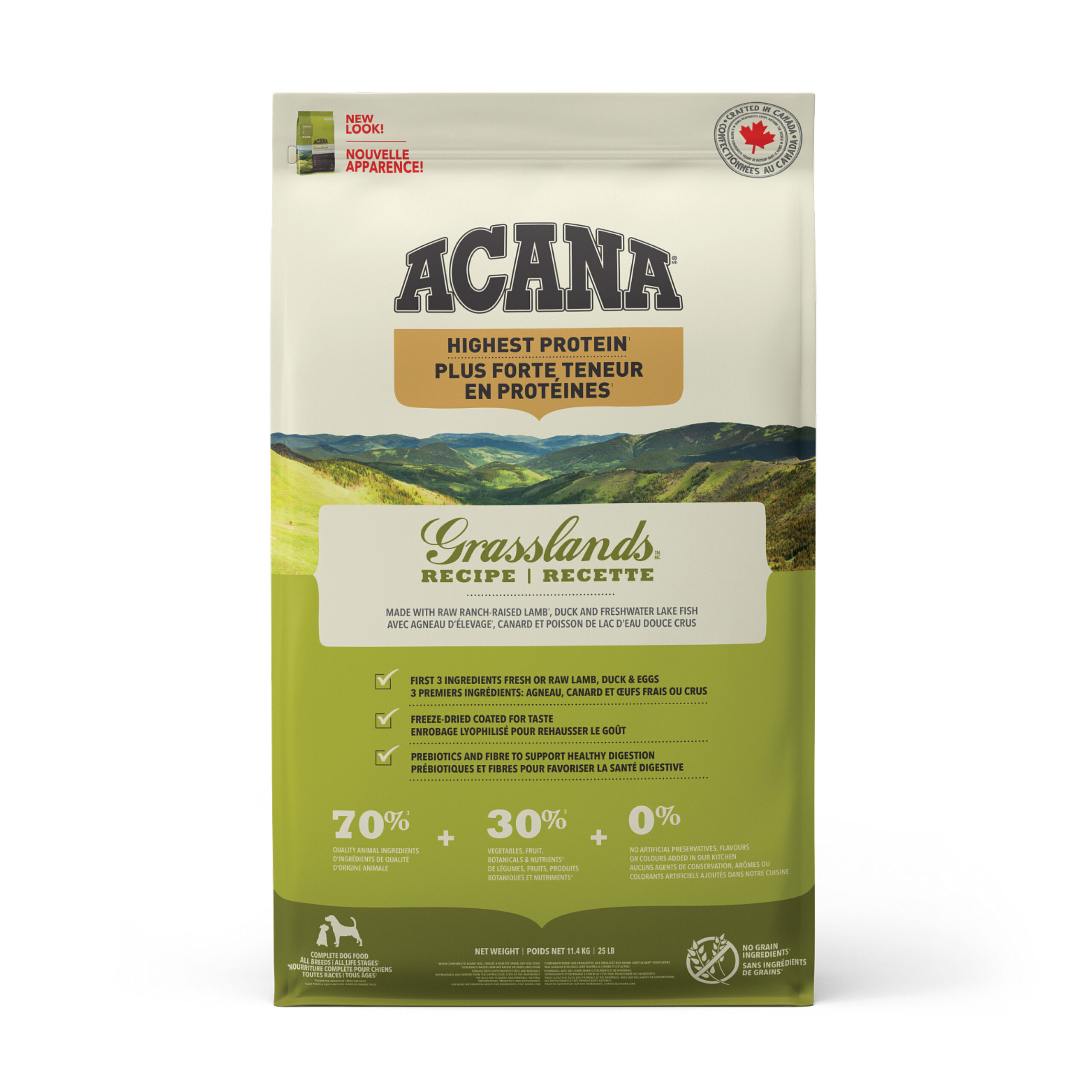 When it comes to ACANA™ recipes, we’re obsessed with choosing ingredients that are nutritious, delicious and protein-rich. Our Highest Protein Dog Food is perfect for satisfying your dog with even more of the animal protein they crave. Our Grasslands recipe is crafted with 70% quality animal ingredients1 like farm-raised lamb, duck, eggs, and freshwater lake fish balanced with 30%2 fruit and vegetables to help nurture your dog with flavour and animal protein. It also includes prebiotics and fibre to help support your dog’s digestive health. And with no artificial colours, flavours or preservatives added in our kitchen, it’s a recipe you and your dog will both love. Nurture your dog with a protein-rich, nutritious, and delicious dog food to help them live a healthy, happy life.