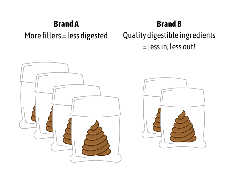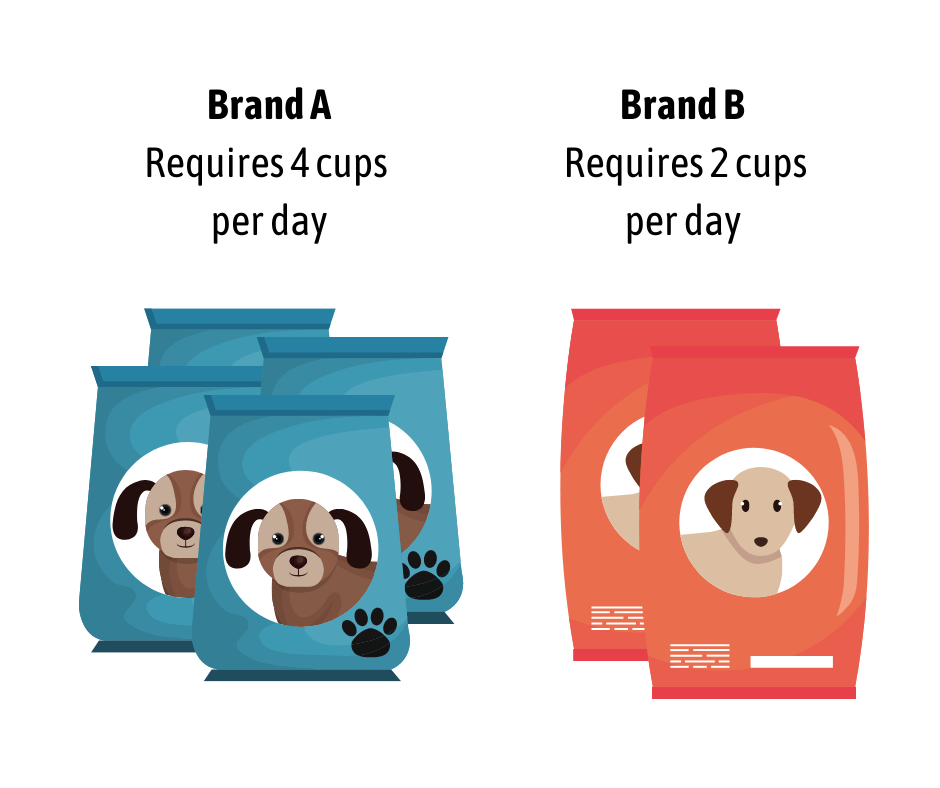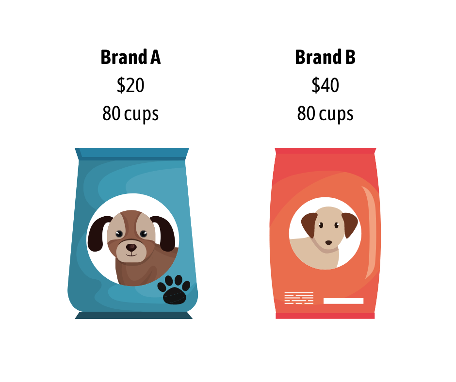 Here is an easy example: Brand A and B have the same cups of kibble per bag, but Brand A is half the price of Brand B. Therefore, we believe Brand A is cheaper.