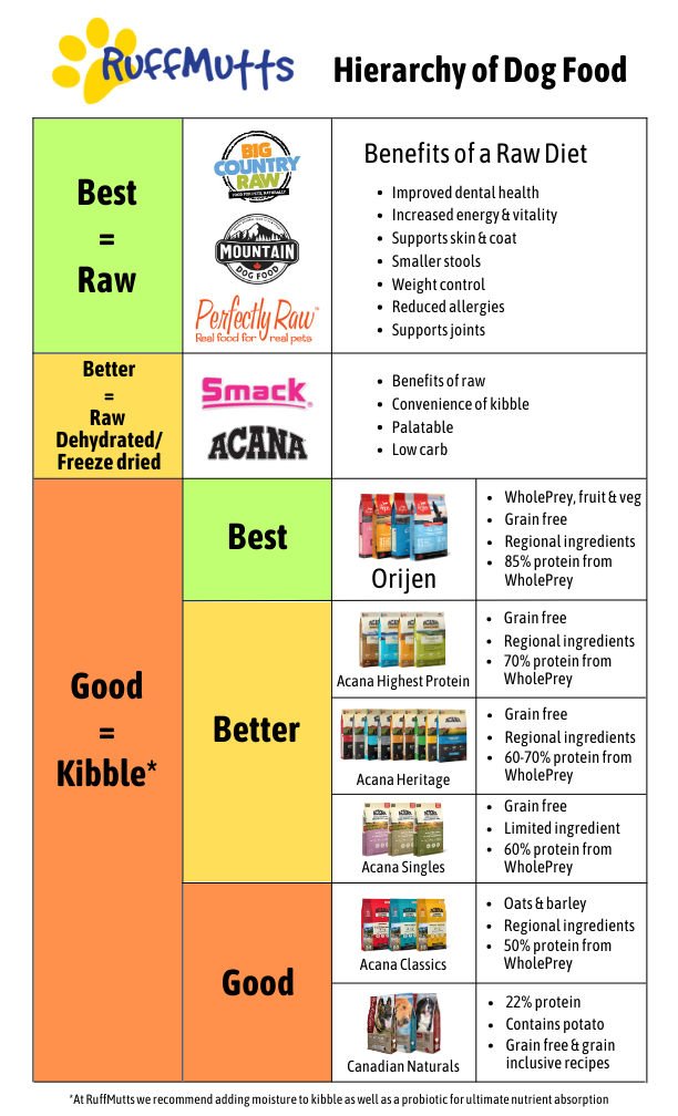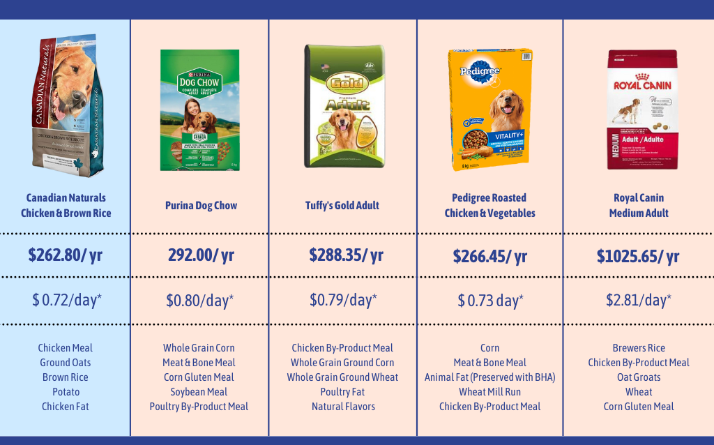 Breaking down how much it costs per day to feed your pet is a valuable tool as it often demonstrates that you can feed your pet better quality food for the same price or even less!!  Hence our slogan “Feed Better for Less!”  At RuffMutts we use this math to ensure we bring in the best food possible at every budget.  We also ensure we only bring in food that we would be willing to feed our own pets.  The best part of that is even though we ensure the food we carry is of the highest quality we can still save you $$$. Almost every food we sell is Canadian made with Canadian ingredients!